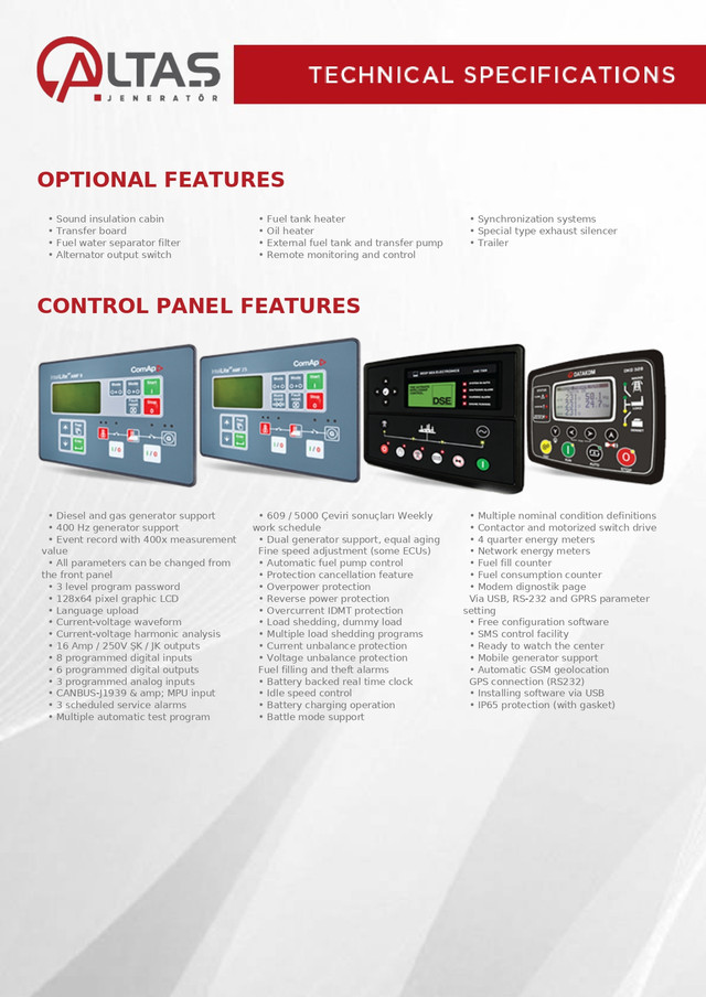 I Стандарти ISO 8528, ISO 3046, BS 5514, DIN 6271, низький паливний бак, встановлений на паливному насосі, механічний або електронний тип.